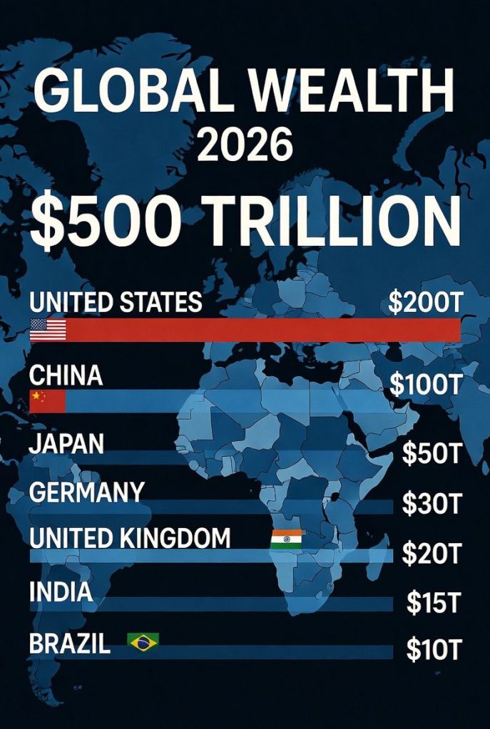 In 2026, total global wealth is estimated at $450–500 trillion. That includes real estate 🏠, stocks 📈, gold 🪙, businesses 🏢, and cash 💵.